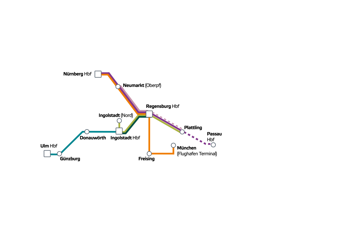 Unser Unternehmenssitz ist in Regensburg. Hier haben wir neben unserer Werkstatt, auch unsere Hauptverwaltung in Bahnhofsnähe. Unsere Triebfahrzeugführer und Servicekräfte im Zug werden einer festen Einsatzstelle zugeordnet, hier beginnt und endet ihre Schicht. Einige unserer Einsatzstellen verfügen zusätzlich noch über eine bzw. mehrere Außenstellen. In unserem Netz Mitte gibt es folgende Einsatzorte: